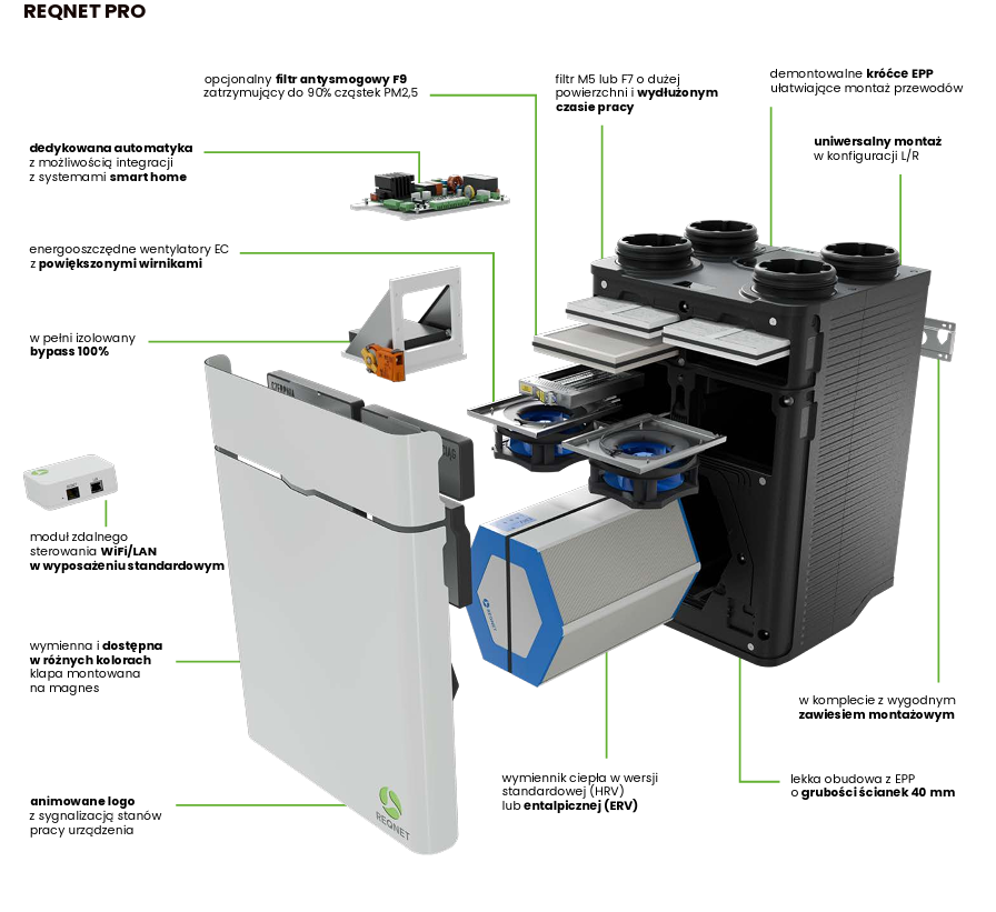 REQNET PRO to nowa seria central wentylacyjnych z odzyskiem ciepła (rekuperatorów), zaprojektowana do pracy w instalacjach wentylacji mechanicznej w budynkach mieszkalnych. Zadaniem centrali jest stała wymiana powietrza: nawiew świeżego i wywiew zużytego, przy jednoczesnym odzysku energii z powietrza usuwanego.