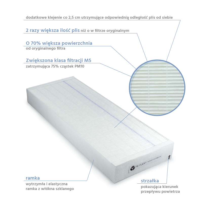 zwiększona klasa filtracji M5 zatrzymująca 75% cząstek PM10