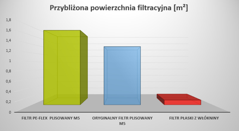 Według najnowszej normy ISO 16890 większość filtrów o klasie mniejszej niż M5 to filtry zgrubne. Nasze filtry posiadają zwiększoną klasę filtracji do poziomu M5 (wg nowej normy ePM10 75% - filtry pośrednie) lepiej chroniąc nasze zdrowie od filtrów oryginalnych G4. Większa powierzchnia filtracji zapewnia dodatkowo większą pojemność pyłową filtra oraz wydłuża czas jego pracy nie powodując dużych oporów powietrza.