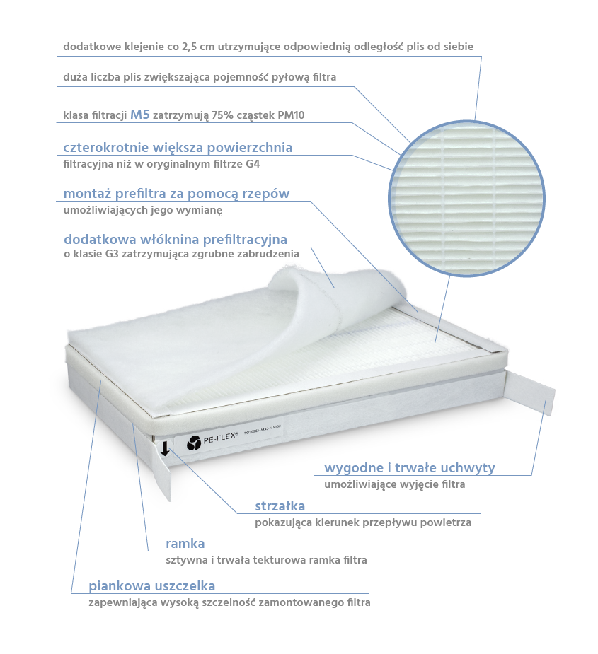 W komplecie z filtrem znajduje się jedna włóknina prefiltracyjna G3. Możliwy jest zakup dodatkowych prefiltrów wydłużających działanie filtra głównego M5.