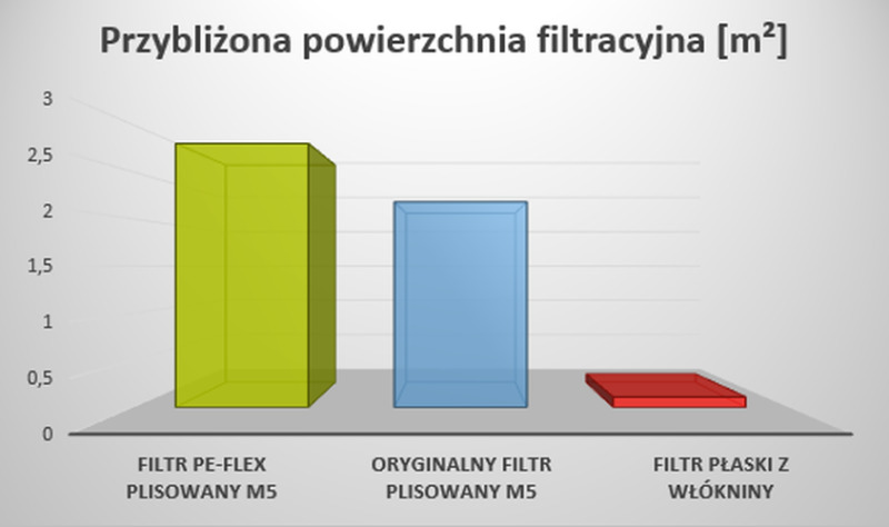 Filtry płaskie z włókniny są tylko z pozoru filtrami najtańszymi. Oferują zazwyczaj niską klasę filtracji, generują duże opory powietrza oraz trzeba je często wymieniać. Tylko filtry plisowane (w tzw. harmonikę) zapewniają optymalną ochronę i mają kilkukrotnie dłuższy czas użytkowania w porównaniu do płaskich filtrów.