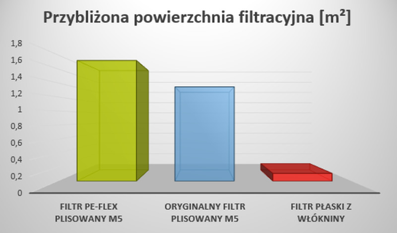 Według najnowszej normy ISO 16890 większość filtrów o klasie mniejszej niż M5 to filtry zgrubne. Nasze filtry posiadają zwiększoną klasę filtracji do poziomu M5 (wg nowej normy ePM10 75% - filtry pośrednie) lepiej chroniąc nasze zdrowie od filtrów oryginalnych G4. Większa powierzchnia filtracji zapewnia dodatkowo większą pojemność pyłową filtra oraz wydłuża czas jego pracy nie powodując dużych oporów powietrza.