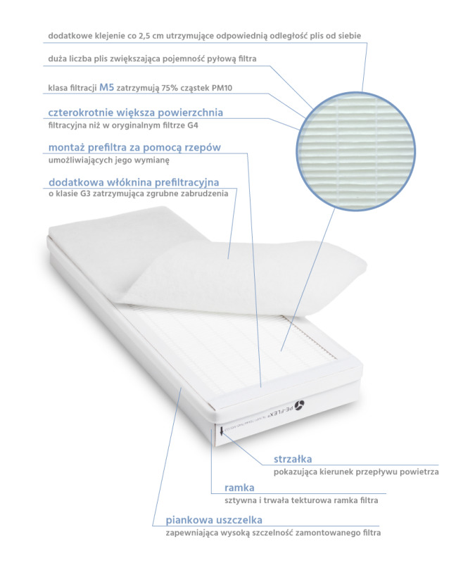 W komplecie z filtrem znajduje się jedna włóknina prefiltracyjna G3. Możliwy jest zakup dodatkowych prefiltrów wydłużających działanie filtra głównego M5.