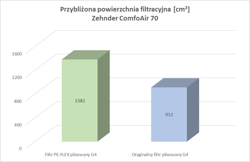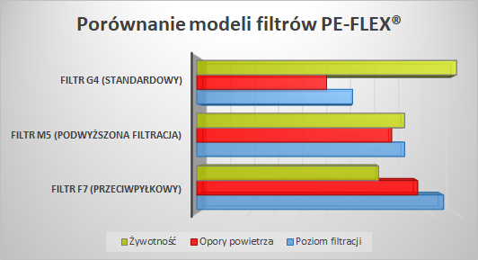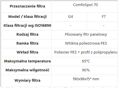 Filtr o klasie G4 polecamy wszystkim, dla których najważniejszy jest długi czas pracy filtra - podwyższona powierzchnia filtra oraz standardowa klasa filtracji zapewnia długie jego działanie. Dla bardziej wymagających użytkowników zalecamy zastosowanie filtrów o klasie F7 który klasyfikowany jest już do filtrów pośrednich i zatrzymuje o wiele więcej zanieczyszczeń. Sstawia on jednak większe opory niż filtr klasy G4 oraz wykazuje krótszy czas działania (osadza się na nim więcej zanieczyszczeń). Filtr F7 jest zalecany dla alergików w sezonie wiosenno-letnim (wyłącznie na kanał nawiewny).