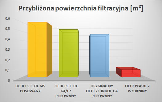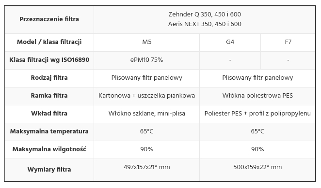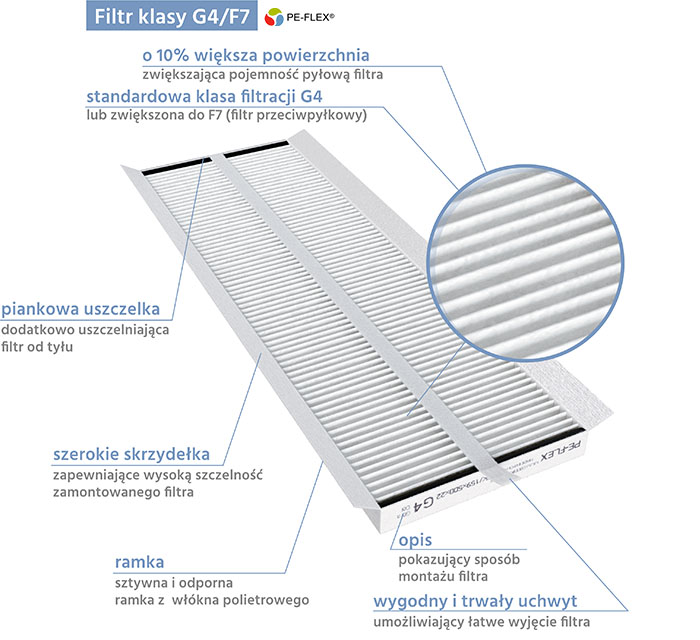 Filtr o klasie G4 polecamy wszystkim, dla których najważniejszy jest długi czas pracy filtra - podwyższona powierzchnia filtra oraz standardowa klasa filtracji zapewnia długie jego działanie. Dla bardziej wymagających użytkowników zalecamy zastosowanie filtrów o klasie M5 (ePM10 75%) , który klasyfikowany jest już do filtrów pośrednich i zatrzymuje o wiele więcej zanieczyszczeń. Pomimo większej powierzchni filtracyjnej stawia on jednak większe opory niż filtr klasy G4 oraz wykazuje krótszy czas działania (osadza się na nim więcej zanieczyszczeń). Dla alergików w sezonie wiosenno-letnim oferujemy natomiast filtry przeciwpyłkowe F7 (wyłącznie na kanał nawiewny).