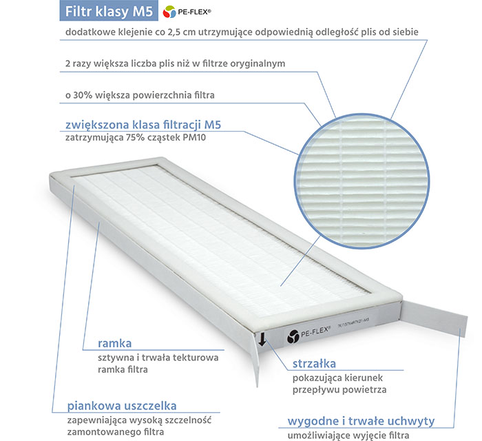zwiększona klasa filtracji M5 zatrzymująca 75% cząstek PM10