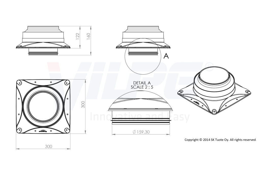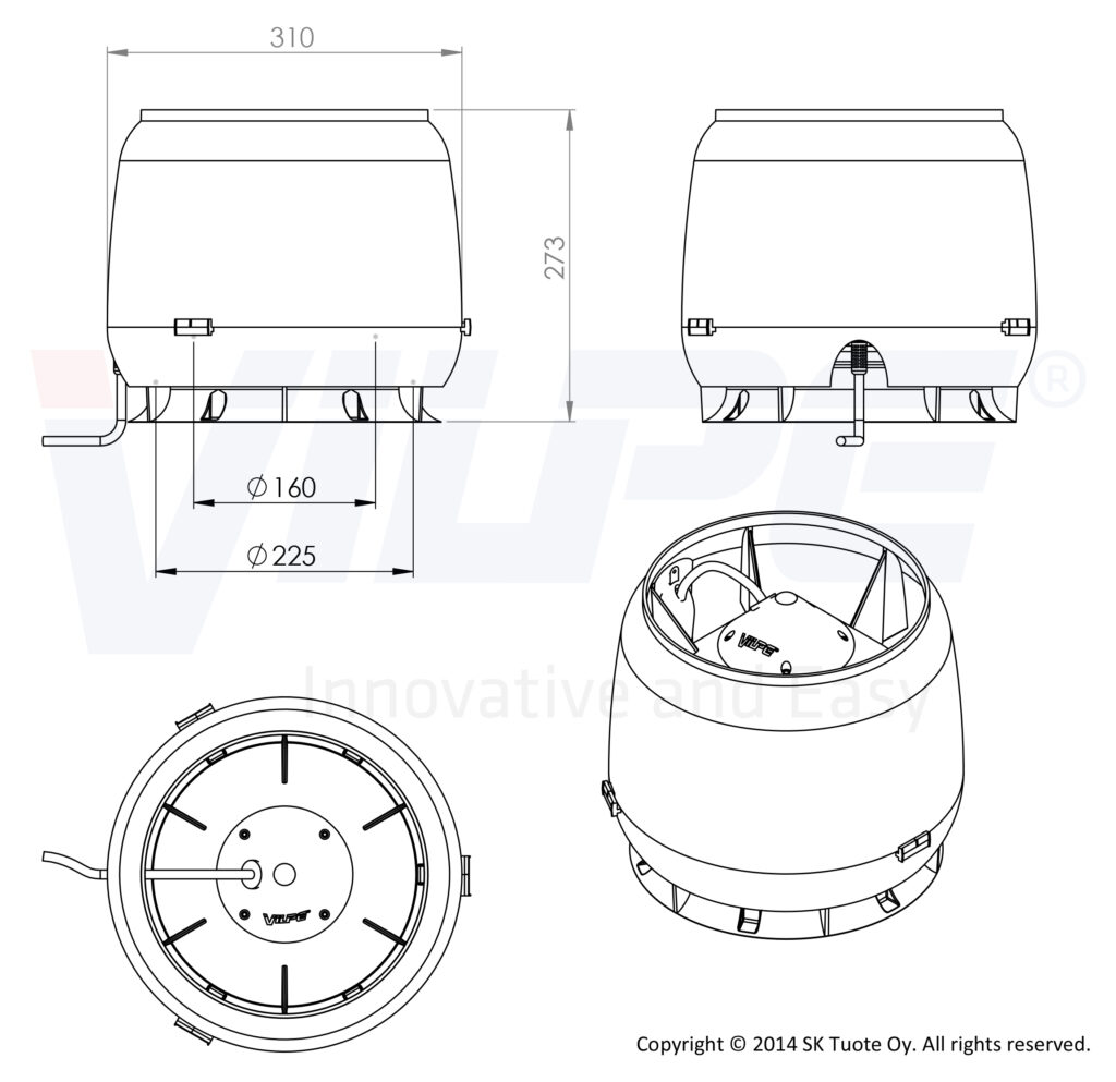 Izolowany wentylator dachowy z silnikiem AC. Przeznaczony do odprowadzania zużytego powietrza w systemach wentylacji mechanicznej (wymuszonej). Montowany na kanale wentylacyjnym przy użyciu dołączonej płyty montażowej lub bezpośrednio na przewodzie wentylacyjnym. Zestaw można rozszerzyć o regulator VILPE. Maksymalna wydajność: 850 m³/h. Wymiary: Przewód wewnętrzny o średnicy Ø 160 mm. Płyta montażowa 300 x 300 mm (powierzchnia montażowa musi mieć co najmniej taki rozmiar). Zawartość opakowania: Wentylator dachowy, płyta montażowa, instrukcja montażu, obsługi i konserwacji.