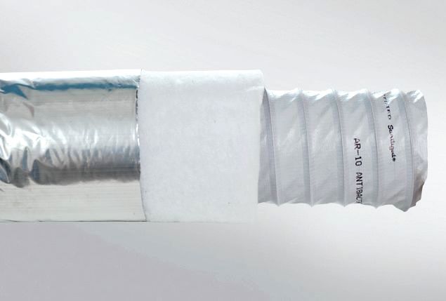 Izolowany antygrzybiczny i bakteriobójczy przewód elastyczny firmy MASTERFLEX przeznaczony do systemów wentylacji mechanicznej z odzyskiem ciepła. Przewód elastyczny wykonany z tkaniny poliestrowej powleczonej żywicami poliolefi nowymi z dodatkiem związku bromu/trójtlenku antymonu i preparatu antybakteryjnego/antygrzybicznego , wzmocniony spiralą z drutu stalowego. Wersja THERM dodatkowo wyposażona jest w termoizolację z włókien poliestrowych oraz zewnętrzny płaszcz z folii powlekanej aluminium (trudnopalnej).