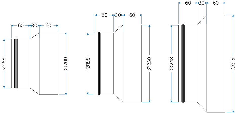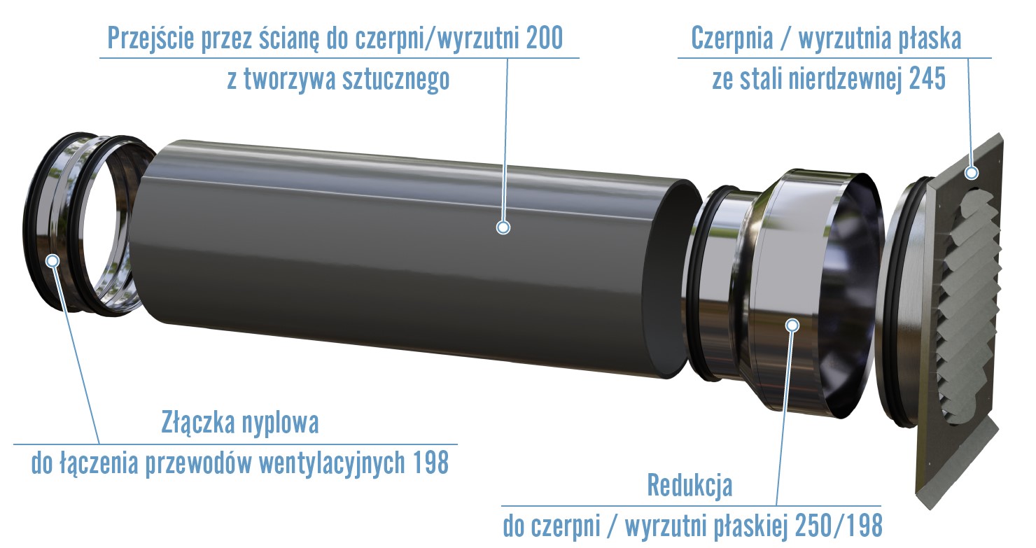Redukcję nakłada się stroną o większej średnicy na króciec z uszczelką czerpni / wyrzutni płaskiej . Redukcja posiada dodatkowo uszczelkę dwuwargową na drugim króćcu, która ułatwia podłaczenie do niej kanałów wentylacyjnych.