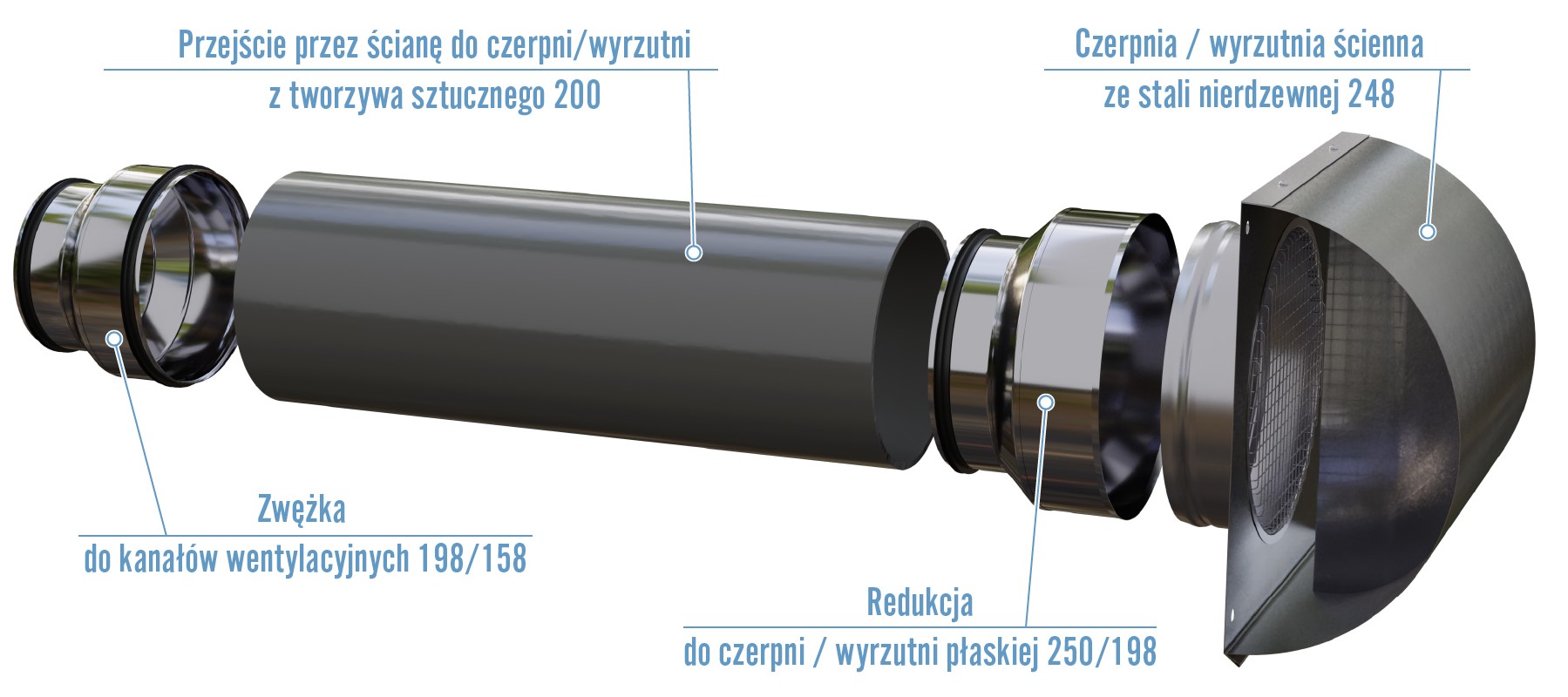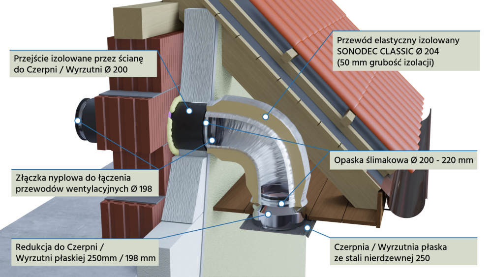 Przykład montażu czerpni/wyrzutni fi 250 w podbitce: