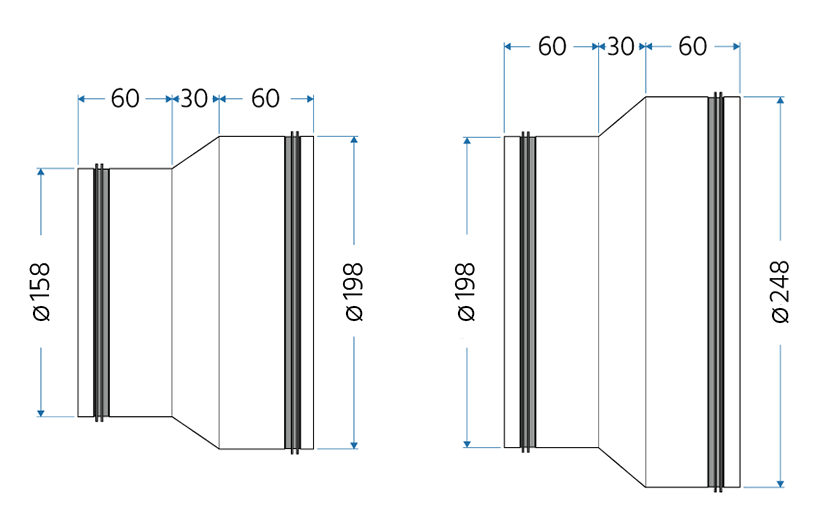 Redukcja nypel-nypel do kanałów wentylacyjnych Zwężki nypel-nypel umożliwiają połączenie kanałów wentylacyjnych o różnych średnicach, np. w przypadku, gdy należy zmniejszyć ich średnicę. Dwustronne złącze nyplowe z uszczelkami pozwala na bezpośrednie połączenie ze sobą kanałów elastycznych (np. SONODEC ) lub sztywnych, a także podłączenie ich z PRZEJŚCIEM PRZEZ ŚCIANĘ . Wykonane są z trwałej stali nierdzewnej.