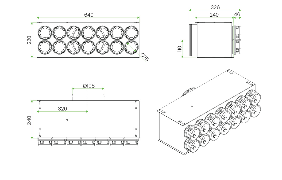 Model NCOQ wyposażony jest w 14 muf przyłączeniowych na przewody PEFLEX Ø75 mm, rozmieszczonych w dwóch rzędach oraz króciec główny Ø198 mm posiadający uszczelkę. Zapewnia maksymalny przepływ powietrza do około 420 m³/h . Uniwersalne uchwyty umożliwiają łatwy montaż zarówno na podłodze, jak i pod stropem.