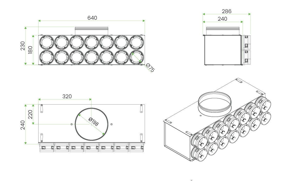Model NCOR wyposażony jest w 14 muf przyłączeniowych na przewody PEFLEX Ø75 mm, rozmieszczonych w dwóch rzędach oraz króciec główny Ø198 mm posiadający uszczelkę. Zapewnia maksymalny przepływ powietrza do około 420 m³/h . Uniwersalne uchwyty umożliwiają łatwy montaż zarówno na podłodze, jak i pod stropem.