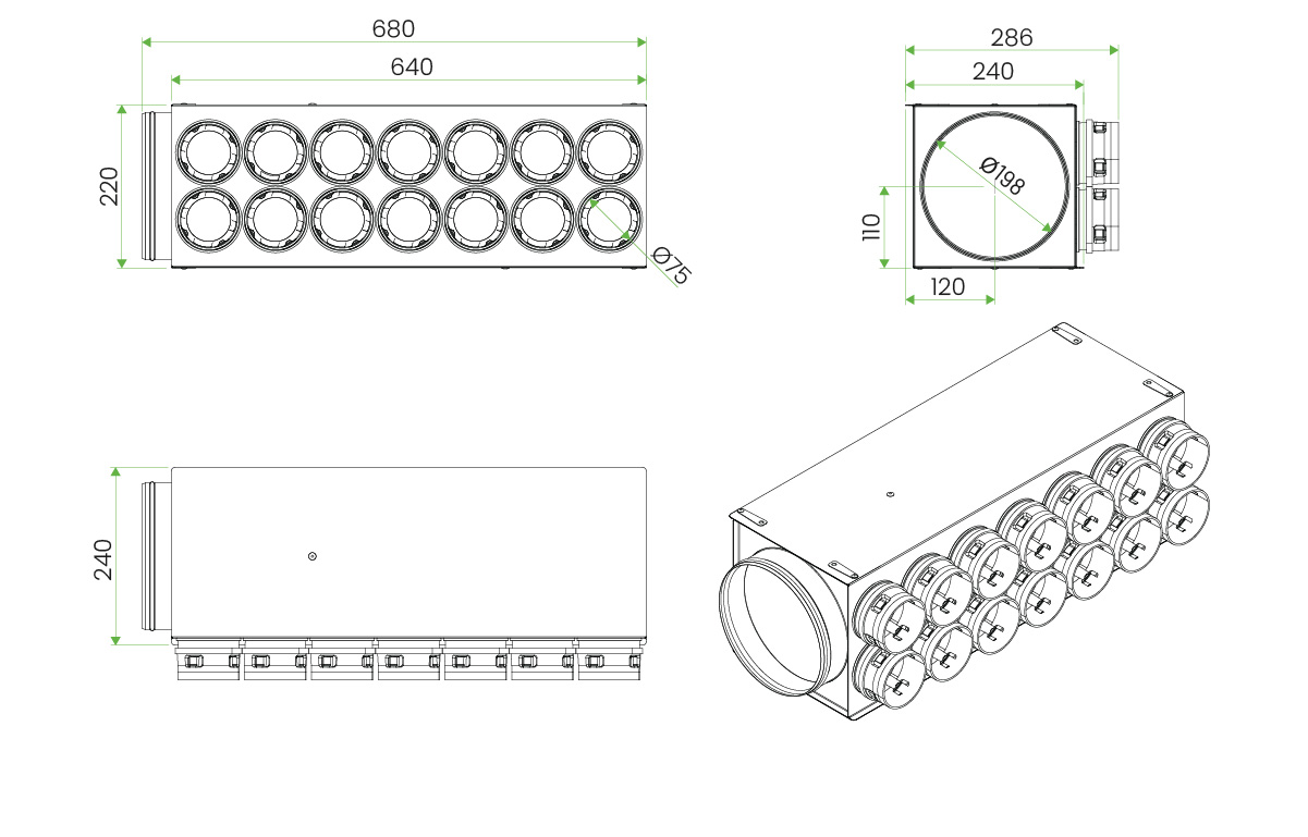 Model NCOS wyposażony jest w 14 muf przyłączeniowych na przewody PEFLEX Ø75 mm, rozmieszczonych w dwóch rzędach oraz króciec główny Ø198 mm posiadający uszczelkę. Zapewnia maksymalny przepływ powietrza do około 420 m³/h . Uniwersalne uchwyty umożliwiają łatwy montaż zarówno na podłodze, jak i pod stropem.