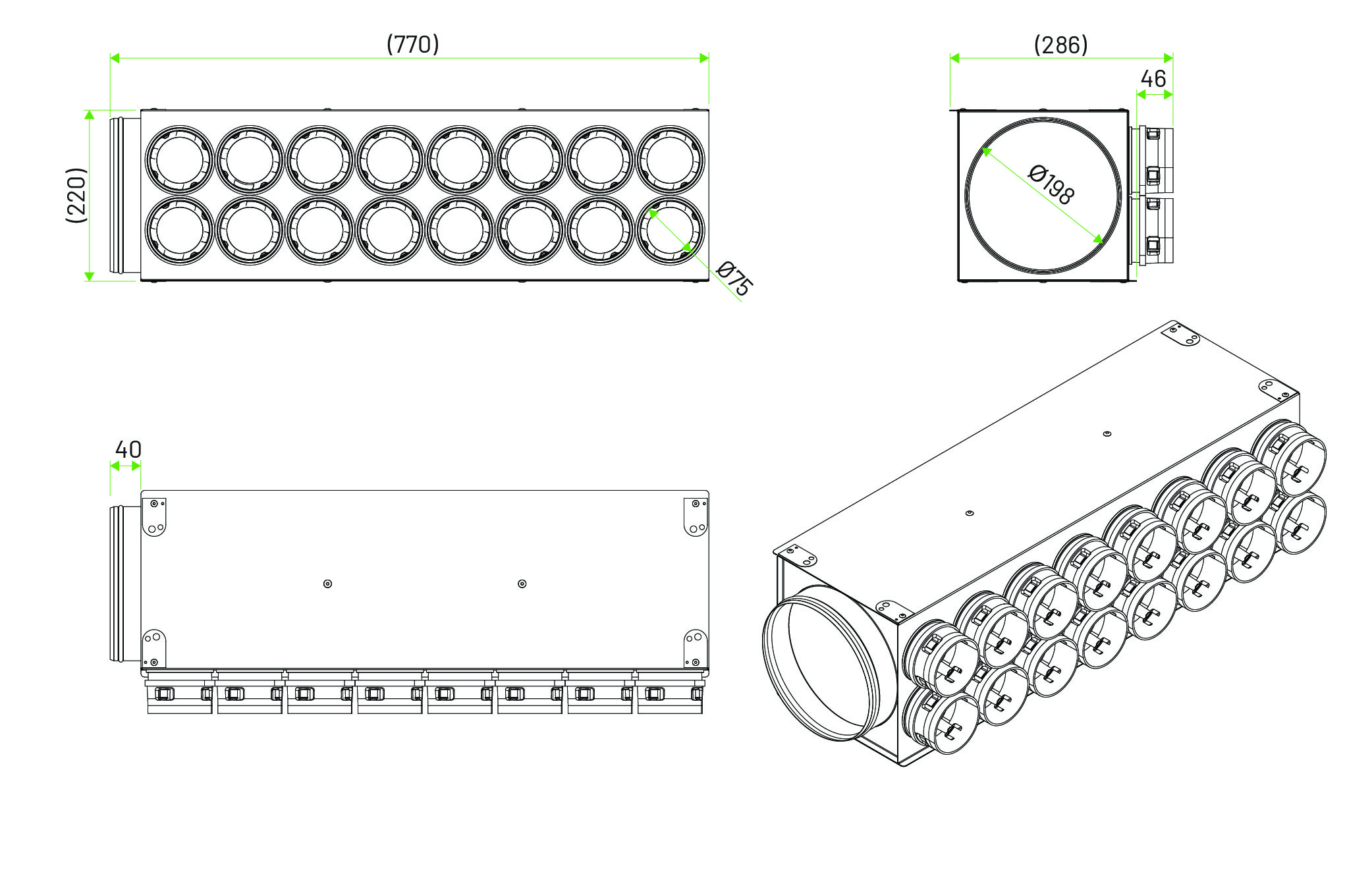 Model NCOV wyposażony jest w 16 muf przyłączeniowych na przewody PEFLEX Ø75 mm, rozmieszczonych w dwóch rzędach oraz króciec główny Ø198 mm posiadający uszczelkę. Zapewnia maksymalny przepływ powietrza do około 480 m³/h . Uniwersalne uchwyty umożliwiają łatwy montaż zarówno na podłodze, jak i pod stropem.