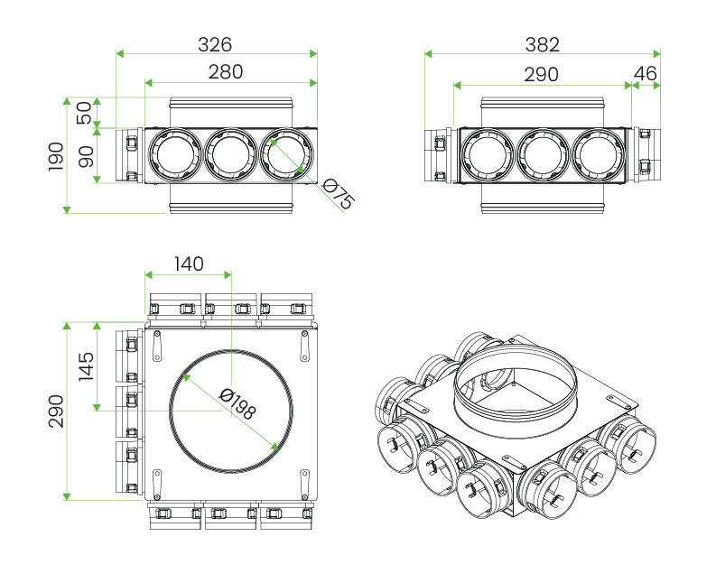Skrzynki rozdzielcze są centralnym elementem układu wentylacji rozdzielaczowej. Służą do rozgałęzienia instalacji nawiewnej i wyciągowej biegnącej od rekuperatora do poszczególnych pomieszczeń.