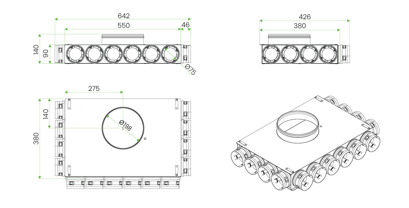 Płaska konstrukcja o wysokości tylko 90 mm umożliwia montaż w ograniczonej przestrzeni – na przykład w warstwie izolacji stropu lub w zabudowie pod sufitem , na stelażu z płyt g-k. Rozdzielacz zapewnia maksymalny przepływ powietrza do około 420 m³/h . Wbudowane uchwyty montażowe umożliwiają instalację zarówno w pozycji leżącej (na podłodze), jak i podwieszonej (pod sufitem).
