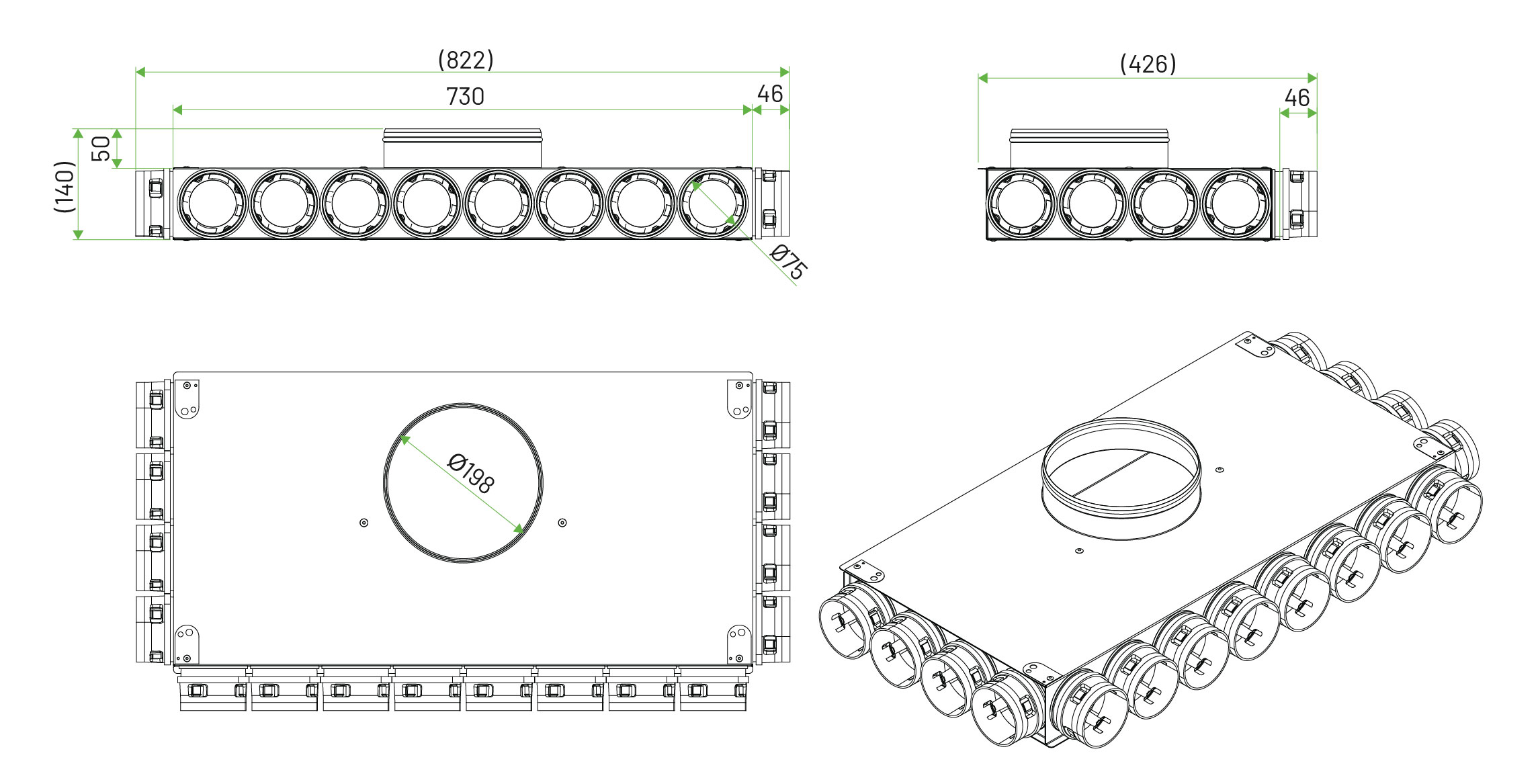 Płaska konstrukcja o wysokości tylko 90 mm umożliwia montaż w ograniczonej przestrzeni – na przykład w warstwie izolacji stropu lub w zabudowie pod sufitem , na stelażu z płyt g-k. Rozdzielacz zapewnia maksymalny przepływ powietrza do około 480 m³/h . Wbudowane uchwyty montażowe umożliwiają instalację zarówno w pozycji leżącej (na podłodze), jak i podwieszonej (pod sufitem).