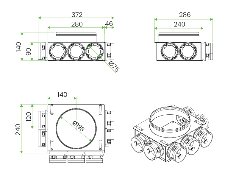 Płaska konstrukcja o wysokości tylko 90 mm umożliwia montaż w ograniczonej przestrzeni – na przykład w warstwie izolacji stropu lub w zabudowie pod sufitem , na stelażu z płyt g-k. Rozdzielacz zapewnia maksymalny przepływ powietrza do około 210 m³/h . Wbudowane uchwyty montażowe umożliwiają instalację zarówno w pozycji leżącej (na podłodze), jak i podwieszonej (pod sufitem).