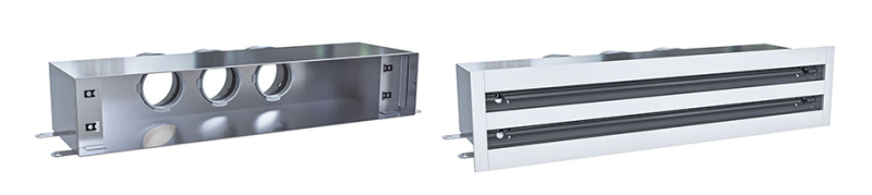 Skrzynki rozprężne do nawiewnika szczelinowego Skrzynki rozprężne ze stali nierdzewnej posiadają mufy polipropylenowe do podłączenia rur wentylacyjnych PEFLEX o średnicy Ø50 mm, Ø75 mm oraz Ø90 mm i przeznaczone są do montażu nawiewnika szczelinowego.