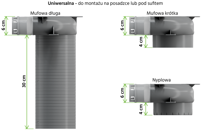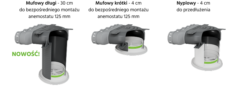 Wersje króćców: mufowy długi 30 cm, mufowy krótki 4 cm, nyplowy 4 cm