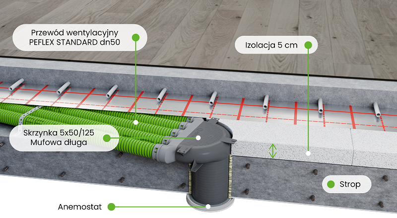 Skrzynki rozprężne PEFLEX PP 50 posiadają uniwersalny montaż podłogowy i sufitowy , co pozwala na ich uniwersalne zastosowanie w różnych typach instalacji wentylacyjnych. Umożliwiają prowadzenie przewodów zarówno w warstwach izolacji na podłodze posadzki jak i łatwy montaż pod stropem oraz w zabudowie g-k. Niezależnie od sposobu montażu, wszystkie modele – zarówno mufowe długie, mufowe krótkie i nyplowe – zachowują pełną szczelność, odporność mechaniczną i kompatybilność z przewodami systemu PEFLEX. Dzięki temu instalator może swobodnie dobrać skrzynkę do miejsca montażu.