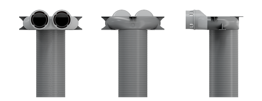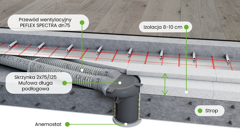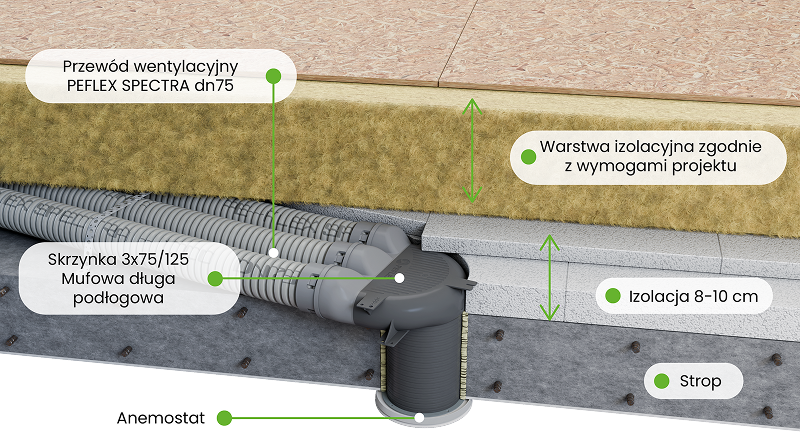 Skrzynki rozprężne PEFLEX PP dostępne są w wersjach podłogowych oraz sufitowych , co pozwala na ich dedykowane zastosowanie w różnych typach instalacji wentylacyjnych. Wersje podłogowe umożliwiają prowadzenie przewodów w warstwach izolacji na podłodze posadzki, natomiast warianty sufitowe – łatwy montaż pod stropem oraz w zabudowie g-k. Niezależnie od sposobu montażu, wszystkie modele – zarówno mufowe długie, mufowe krótkie i nyplowe – zachowują pełną szczelność, odporność mechaniczną i kompatybilność z przewodami systemu PEFLEX. Dzięki temu instalator może swobodnie dobrać skrzynkę do miejsca montażu.