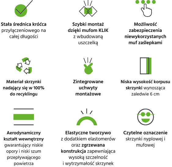 Zastosowanie muf z systemem KLIK umożliwia bardzo szybki montaż kanałów wentylacyjnych w skrzynkach za pomocą jednego ruchu! I to bez konieczności ręcznego zakładania uszczelek na rury i używania specjalistycznych narzędzi. Dodatkowo system KLIK zabezpiecza przed samoistnym wypięciem się rury.