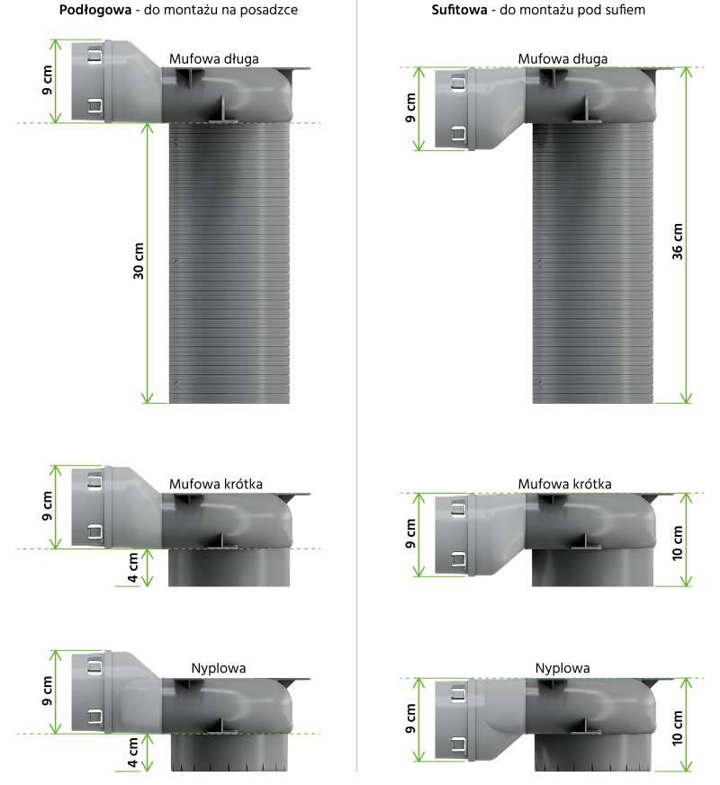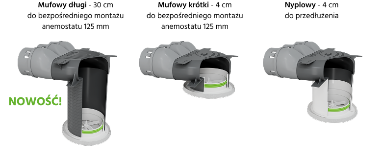 Wersje króćców: mufowy długi 30 cm, mufowy krótki 4 cm, nyplowy 4 cm