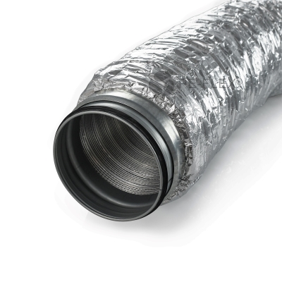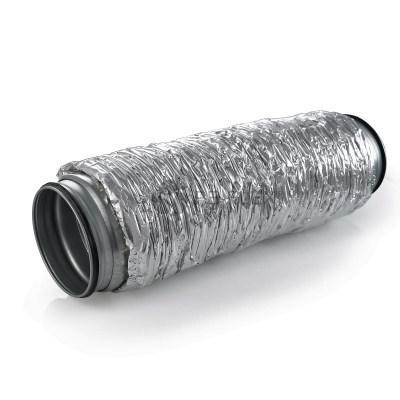 Izolowany tłumik elastyczny firmy DEC przeznaczony do systemów wentylacji mechanicznej z odzyskiem ciepła Tłumik AKUDEC sałada się z mocnego, półelastycznego kanału wewnętrznego wykonanego z wielowarstwowego ryflowanego aluminium oraz zewnętrznego laminowanego elastycznego płaszcza. Przestrzeń między kanałem wewnętrznym i zewnętrznym jest wypełniona materiałem dźwiękochłonnym o grubości 25 mm lub 50 mm . Włókninowa bariera pomiędzy kanałem wewnętrznym, a wełną szklaną zapobiega dyfuzji cząstek wełny szklanej. Tłumik posiada zakończenie nyplowe wraz z uszczelką. Dzięki bardzo dobrym właściwościom tłumiącym dźwięki idealnie nadaje się do podłączenia rekuperatora ze skrzynkami rozdzielczymi .